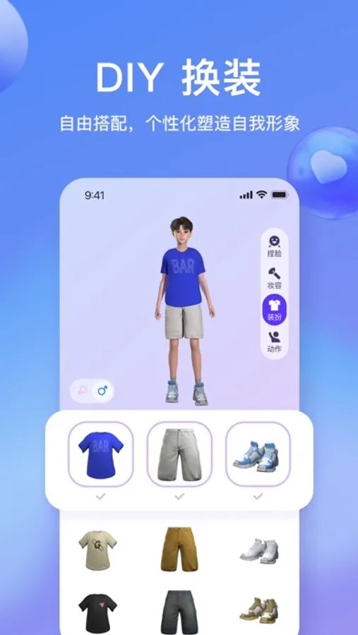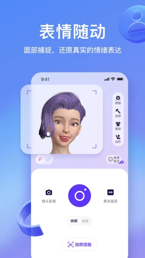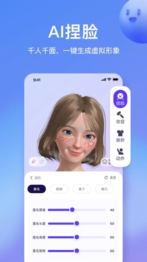 You can quickly generate your 3D virtual avatar through AI technology by taking photos and adjusting the virtual avatar's face, eyes, eyebrows, nose, mouth, etc., as you wish.