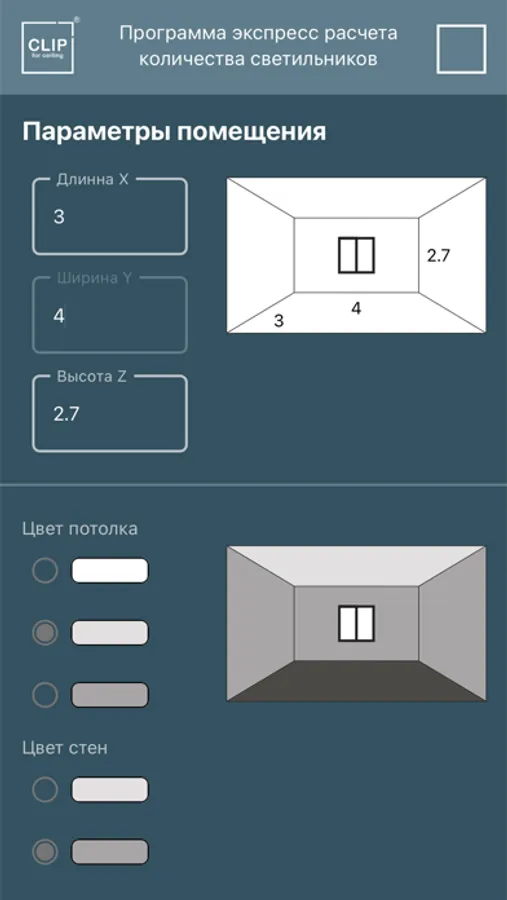 Приложение для расчёта количества безрамных светильников AntiSPOT. Используется для расчёта необходимого количества светильников с учетом типа, мощности светильника и параметров помещения