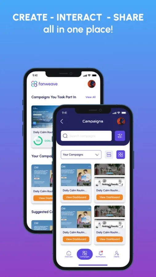 Fanweave boasts an innovative marketing mix with its user-centric features and multifaceted accessibility. Splitting the structure of peer-to-peer marketing between clients and fans empowers fans to interact with their favourite brands and campaigns more easily, and allows clients to attain maximum campaign visibility and brand loyalty – all in one place! Get the united boost of both social and peer-to-peer marketing with our flawless and interactive services.
