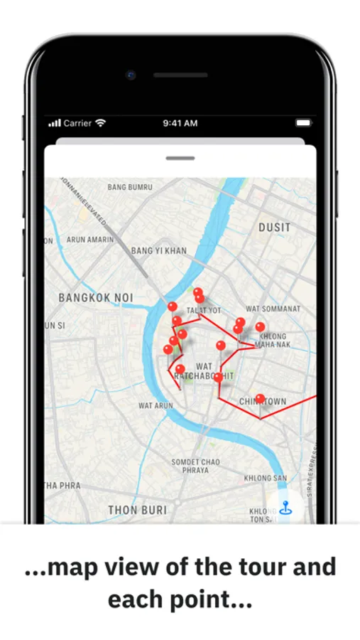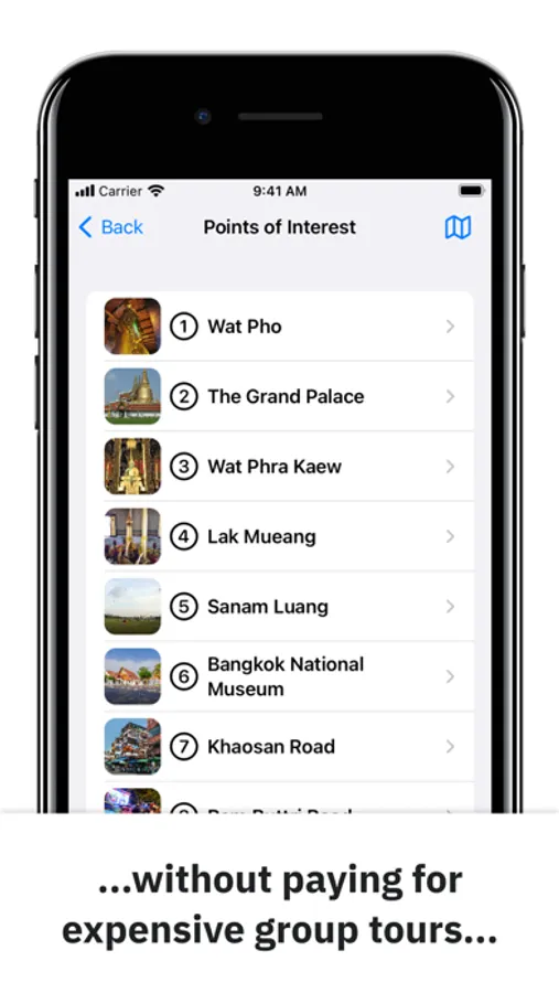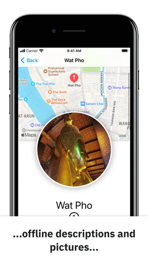 Each one of Bangkok landmarks is ordered following the walking tour and contains a description of the sight, a map of the situation and walking navigation indications to get from one point to the other using Maps. Landmarks contain a simple description so you can enjoy the surroundings and explore what interest you.
