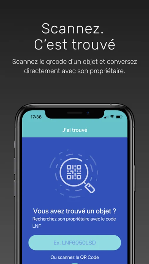 Notre objectif est de protéger et de récupérer les objets qui comptent pour vous. Dès l'ouverture de l'application, un trouveur peut lancer une recherche sur un objet trouvé. Il suffit de faire une recherche avec le code LNF indiqué sur l'objet et si le code correspond à un objet, la fiche d'identification de l'objet s'affiche. Si un trouveur ne dispose pas de l'application LNF, il peut néanmoins identifier un objet trouvé et contacter son propriétaire.