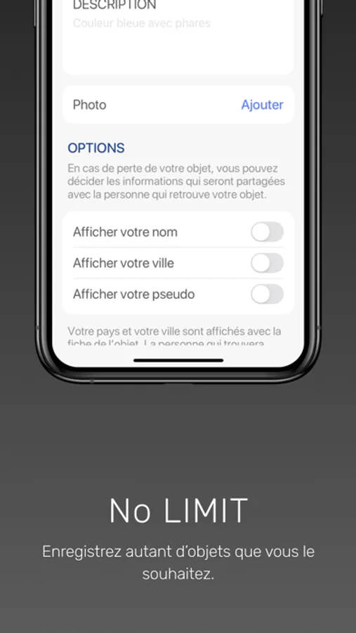 Vous pouvez également étiqueter tous vos objets à l'aide d'un code QR fourni par l'application. Si votre objet perdu ou trouvé est marqué d'un code QR, le trouveur n'aura qu'à scanner le code QR avec son smartphone pour être redirigé vers une page web contenant les informations de contact fournies par le propriétaire.