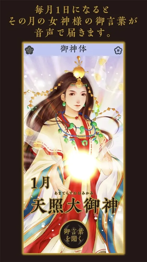※最初から聞きたい場合は、メニューに戻り、「今月の女神さまからの御言葉」をタップしてください。