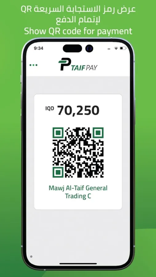 Show your customers a dynamic QR code. Taif Islamic Bank customers can make payments by scanning the code using TIB Online mobile application.