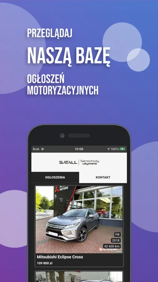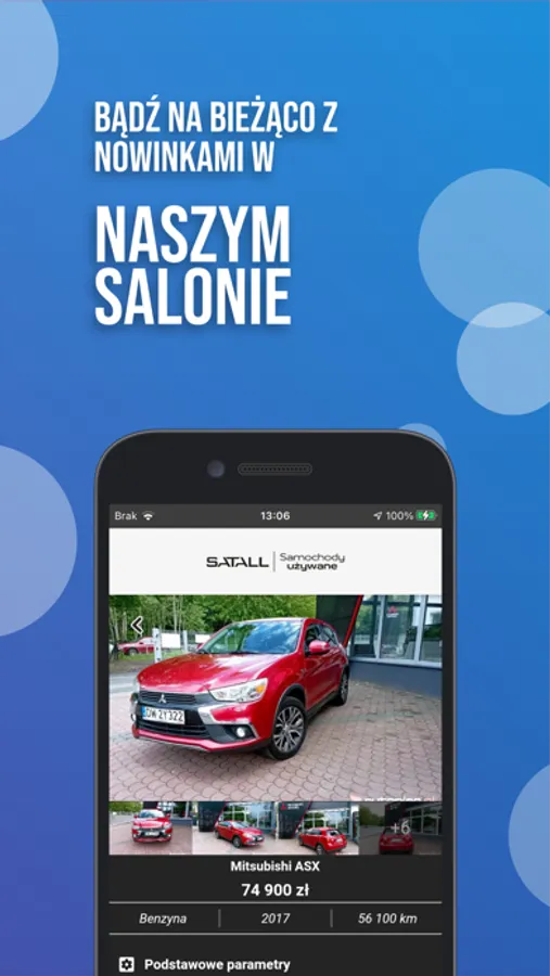 Dzięki aplikacji Satall masz dostęp do przeglądania oferty autoryzowanego dealera Mitsubishi. Pakiet filtrów umożliwia wybór aut nowych, używanych, terenowych oraz SUV. Powiadomienia push w aplikacji będą Cię informować o nowych pozycjach na liście pojazdów. Aplikacja umożliwi Ci również stały kontakt z nami.