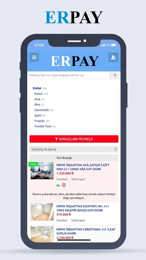 • Konut, arsa, işyeri arayışlarınızda da yanınızda olan ERPAY uygulaması ile gerek sıfır, gerek 2. el tüm satılık ve kiralık emlak ilanlarına erişebilir, en yeni projeleri inceleyebilirsiniz.