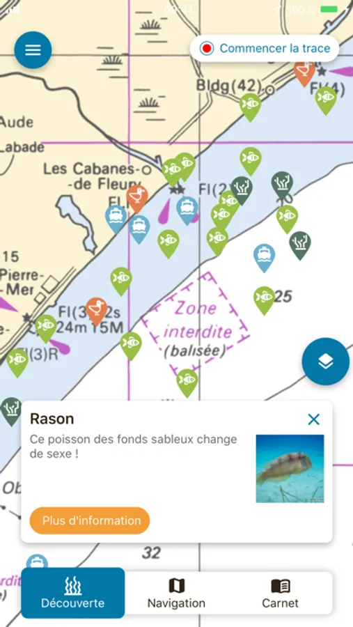 2/ En mode découverte, vous pouvez découvrir l’environnement marin grâce à des points d’intérêts. Ils vous donnent accès à de nombreuses photos et informations sur la biodiversité. Vous pouvez faire apparaître différents éléments sur votre carte : les secteurs d’aires marines protégées, la réglementation environnementale, la faune aérienne, la faune sous-marine, les fonds sous-marins et les bonnes pratiques.