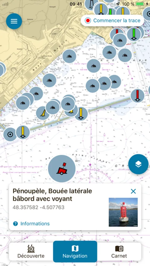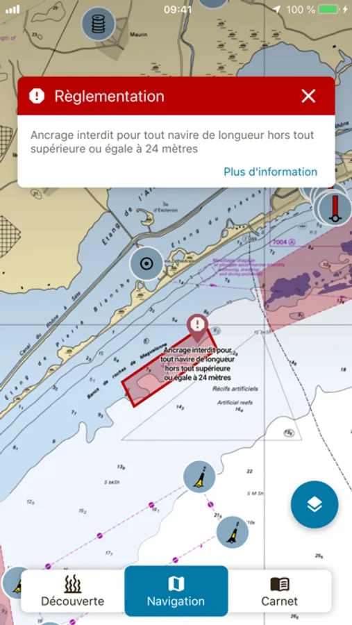 1/ En mode navigation, sélectionné par défaut, vous pouvez choisir d’afficher différents éléments sur la carte marine : les amers, les balises fixes, les balises flottantes, la réglementation et les secteurs d’herbiers. (A noter : les documents nautiques officiels sont les seuls garants de votre sécurité).Vous pouvez également enregistrer votre trace de navigation. Vous la retrouverez dans votre carnet de navigation. Vous êtes informé de votre entrée dans une aire marine protégée ainsi que des zones soumises à une réglementation environnementale particulière.