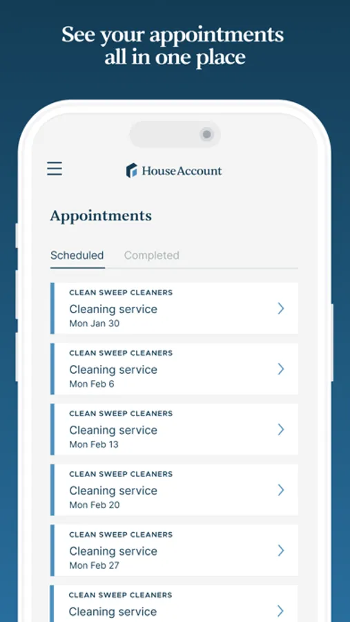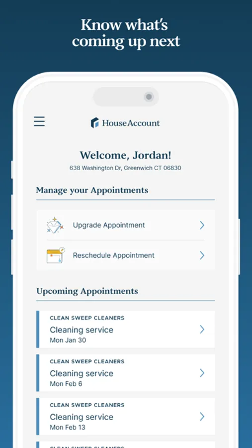 Take the homework out of home maintenance. HouseAccount is the easiest way to manage your home service providers. We make it easy for you to view upcoming and completed appointments. Upgrade your appointments with add-on services and easily reschedule appointments — all in the app.