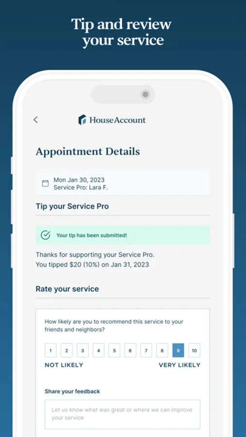 After your appointments are complete, easily rate and tip your service provider. Leave your providers feedback to celebrate or improve services.