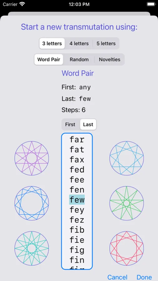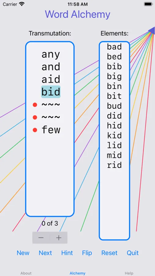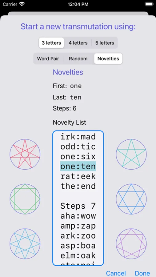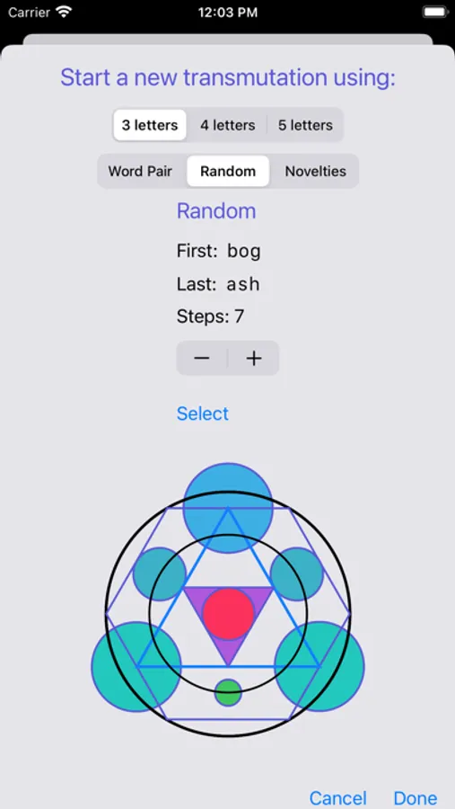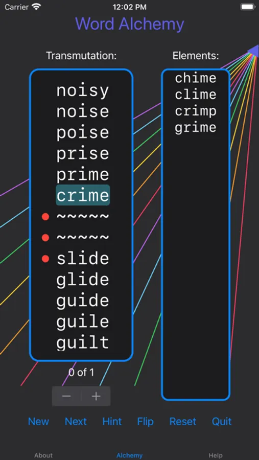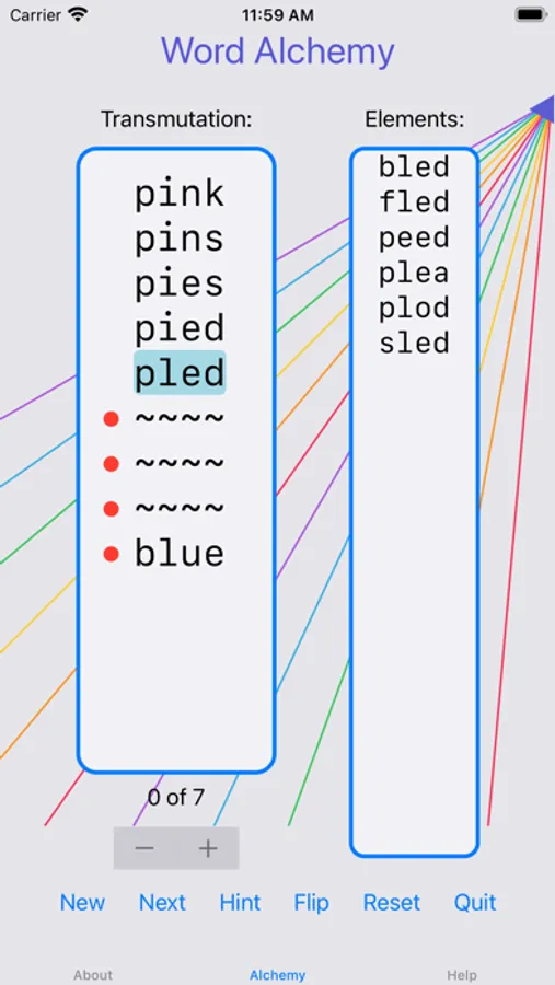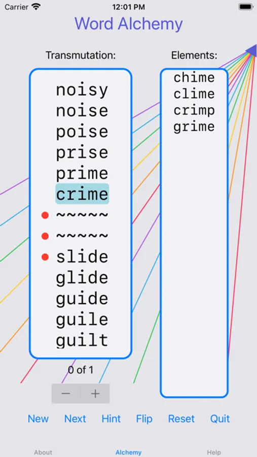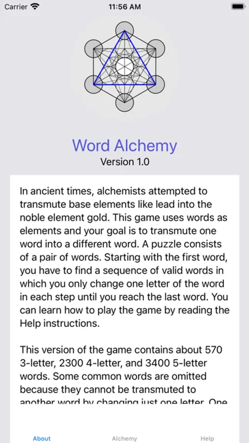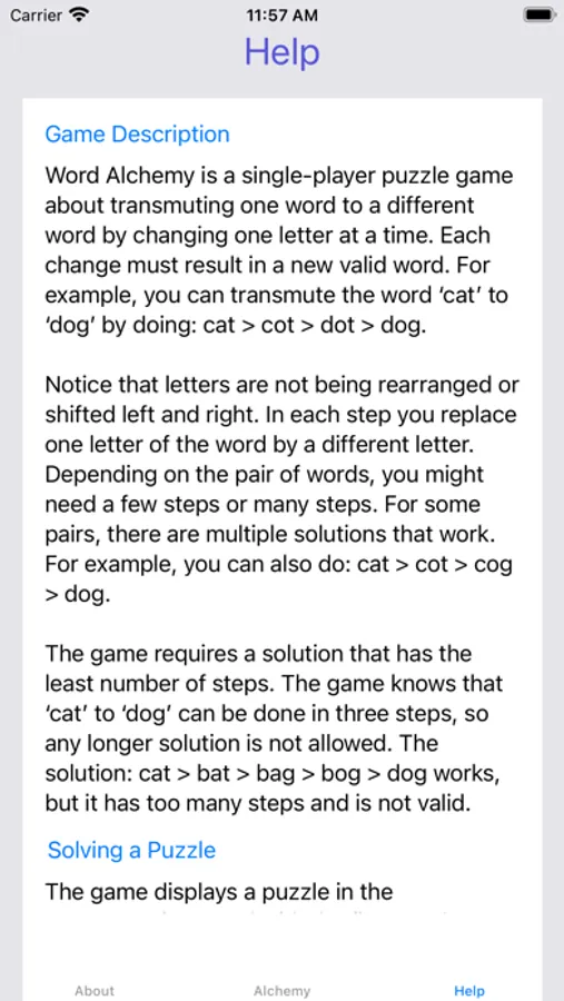 In ancient times, alchemists tried to transmute base elements like lead into the noble element gold. This game uses words as elements and your goal is to transmute one word into a different word. A puzzle consists of a pair of words. Starting with the first word, you have to find a sequence of valid words in which you only change one letter of the word in each step until you reach the last word.