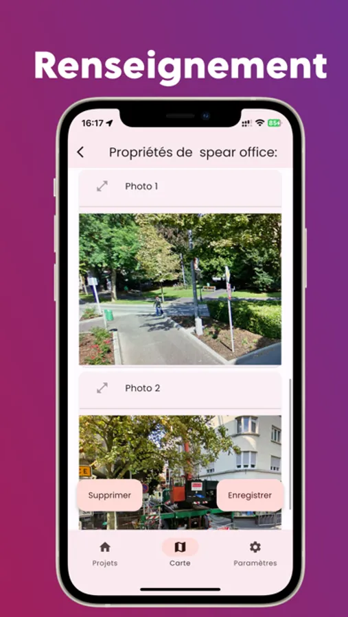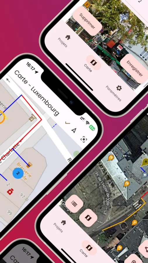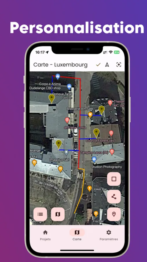 Drawn lines and points can contain photos and custom properties. Items displayed on the map are customizable to adjust their visibility. Your data is automatically synchronized with your design office through the cloud.