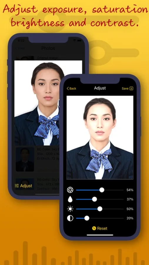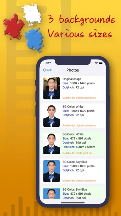 'SelfID Photo' applies person segmentation technique to replace the original background with some common colored backgrounds (white, sky blue and red). It also crops the photo into various formats and sizes commonly use for digital submission and printout. You can further adjust each single photo's exposure, saturation, brightness and contrast.