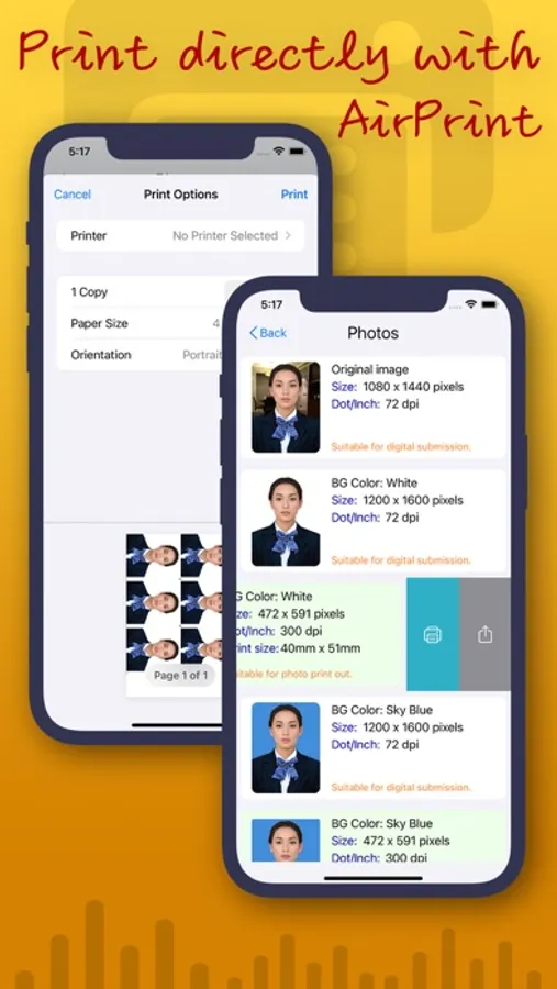 All photos taken by 'SelfID Photo' can be shared to other Apps in the iOS sharing menu, and those cropped to printable formats can also be printed directly to AirPrint supportable printer.