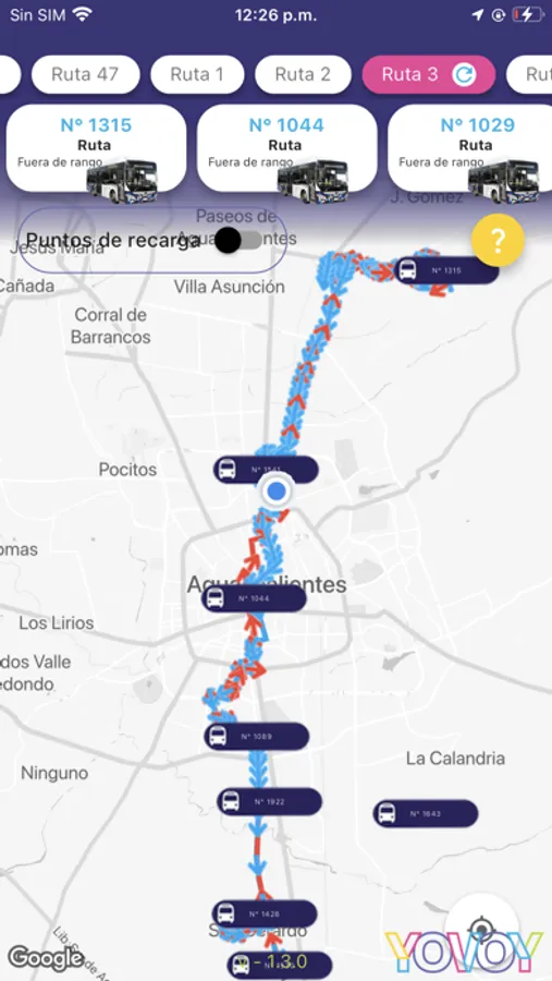 Muestra las rutas, las unidades, el tiempo aproximado del transporte urbano en Aguascalientes, así como también los puntos de recargas de las tarjetas de YOVOY.