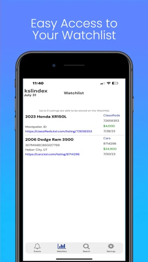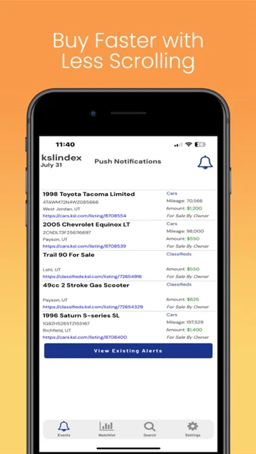 Never miss out on the latest opportunities again! kslindex keeps you informed in real-time with push notifications. Tailor your notification preferences to receive alerts on the listings that matter most to you. Whether it's specific categories, price ranges, specific vin, and more! You'll stay informed about the opportunities that align with your interests.