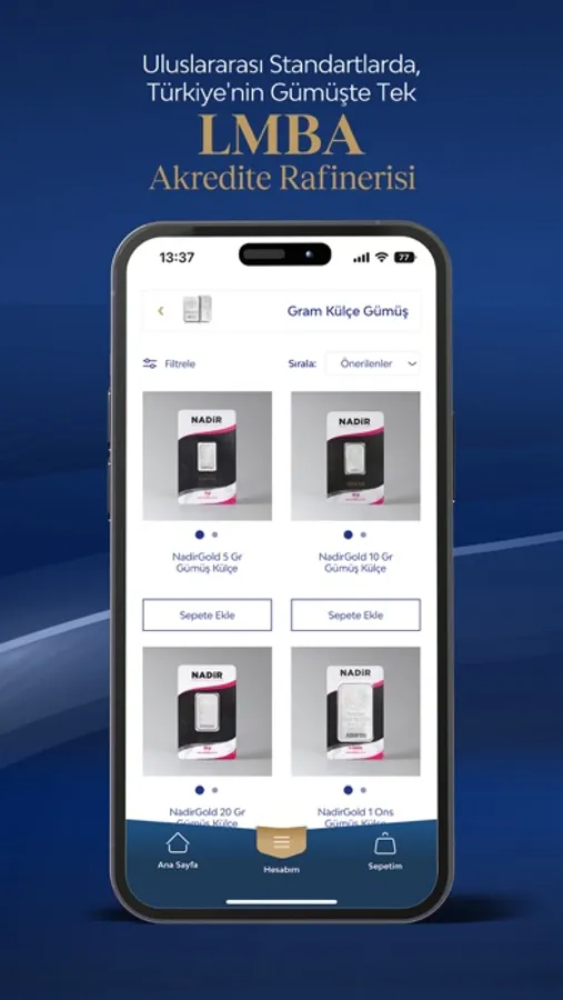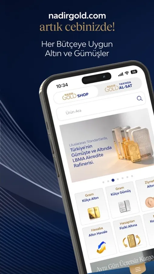 Kolay ve zahmetsiz bir şekilde Altın ve Gümüşe ulaşmanın en hızlı yolunu sunan NadirGold Mobil uygulamamız; kolay, anlaşılır ve kullanıcı dostu arayüzleriyle müşterilerimize birçok yenilik sunmaktadır. Mobil uygulamamız üzerinden satışa sunulan altın ve gümüş ürünlerimiz dünyanın her yerinde kabul ve işlem gören sertifikalı olup, yüksek güvenliğe sahiptir.
