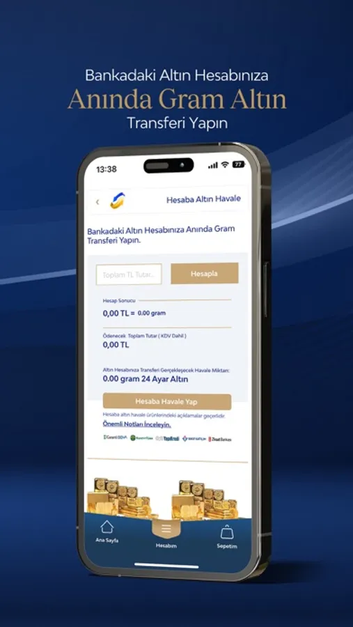 - Tüm müşterilerimiz “Hesaba Altın Havalesi” kategorimiz ile mobil uygulama üzerinden seçecekleri altın miktarını hesaplarına aktarabilirler. (Belirtilen bankalar aracılığı ile)