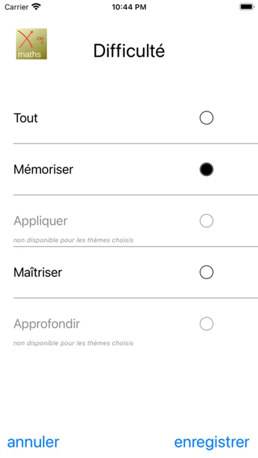 Dans les paramètres il est possible de choisir le niveau et les thèmes à réviser.