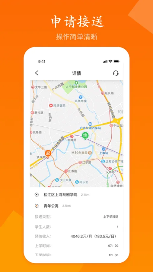 行程服务:接单后,接送员根据用户指定时间,在指定起点出发,接上用户,前往目的地.整个行程用户端可以实时定位行程路线信息.