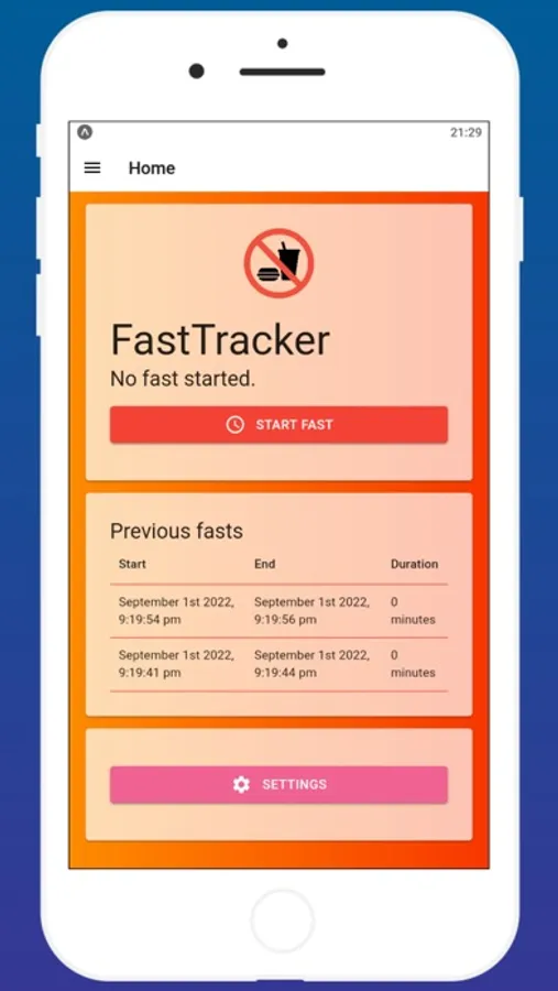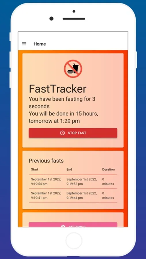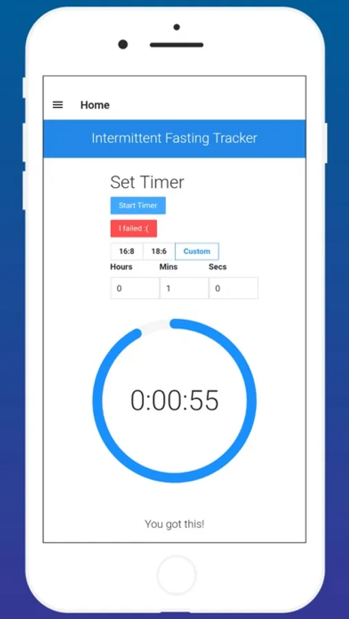 To keep track of a new fast, users must first set up the timer by selecting an option from the menu of common fasts (i.e., 16:8, 18:6) built into the application, or developing a custom fast. The time for the fasting period is then entered into a circular timer, and the time will count down towards 0:00:00. Adjacent to the circular timer is an icon showing the type of fast and two buttons allowing the user to start and stop the timer. If the user stops the timer before the timer has reached 0:00:00, the user has failed the fast; if the timer successfully reaches 0:00:00, the user has succeeded in the fast.