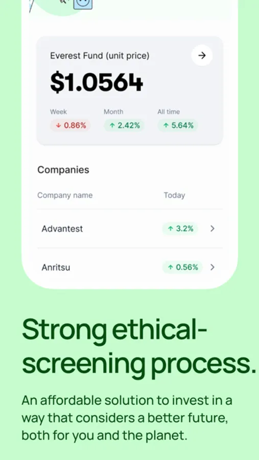 Quick onboarding into the Super Obvious Everest Fund via our user friendly app. Answer a few questions about yourself, provide some ID and start investing with just $1. It really is that simple.