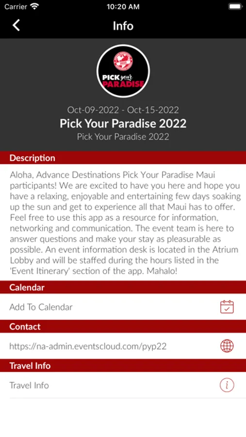 An event app designed to give our attendees all the information needed for our 2022 Pick Your Paradise programs.