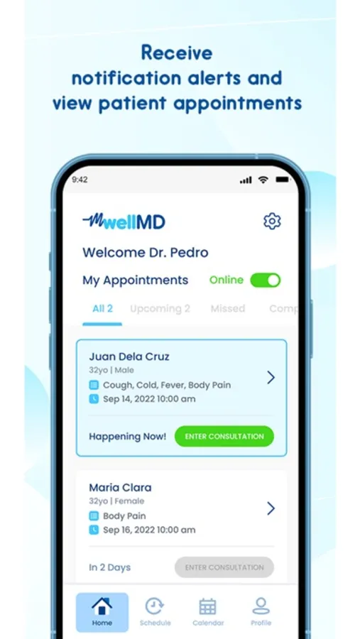 Receive notification alerts: Upcoming appointments for CONSULT NOW; Appointments reminder for CONSULT LATER