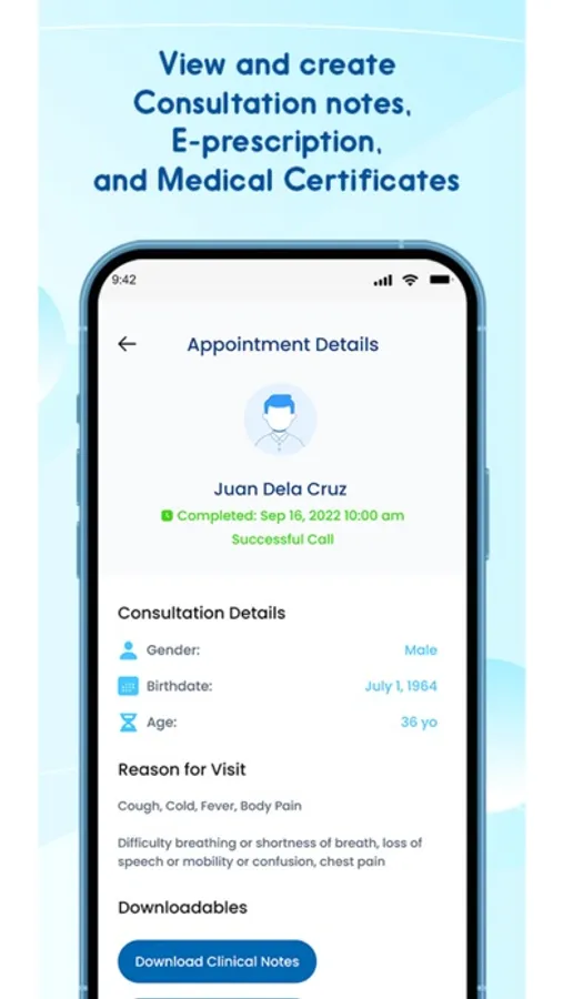 View and create the following documents: Consultation Notes, E-Prescription, Medical Certificate