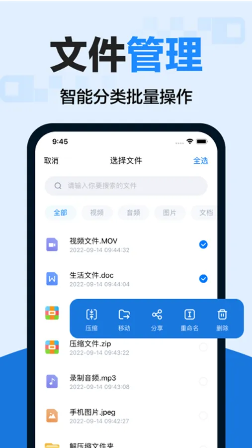 - 文件管理:批量删除、压缩、分享文档,方便快捷。