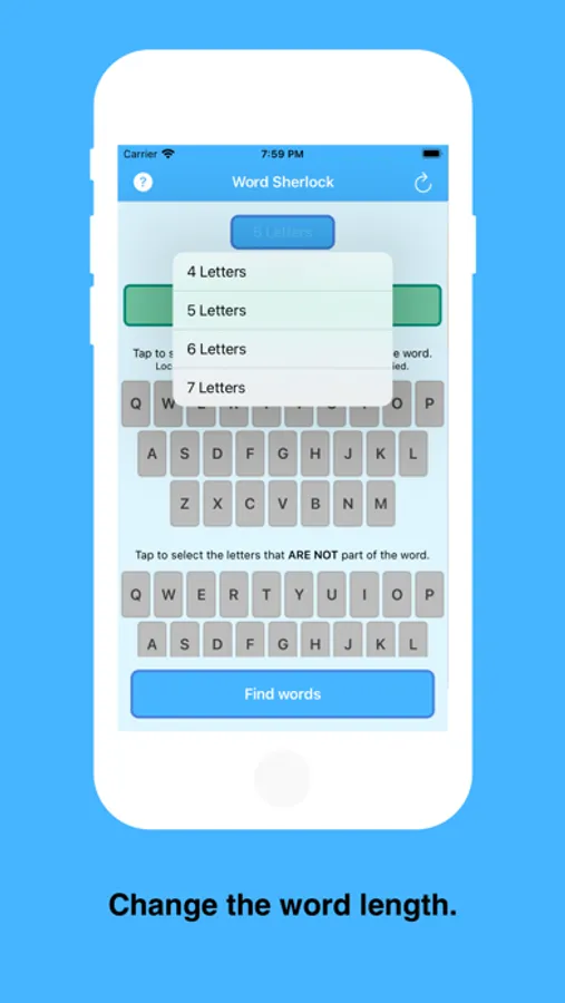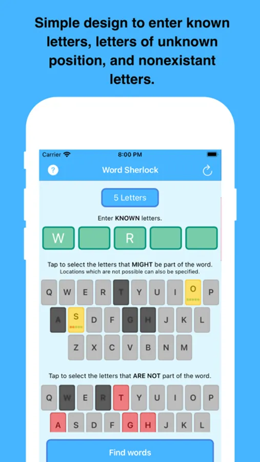 Have difficulties finding words for classic games like WORDLE, SCRABBLE or CROSSWORDS? Want to impress your friends how quickly you can solve various word games? Then Word Sherlock is for you. This simple app can help you quickly and easily find words to solve various word games.