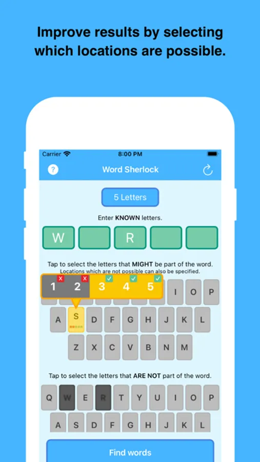 3. Enter letters in the word but whose location is unknown, possible locations can be disabled/enabled.