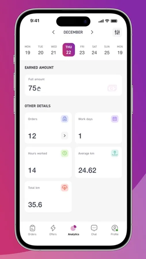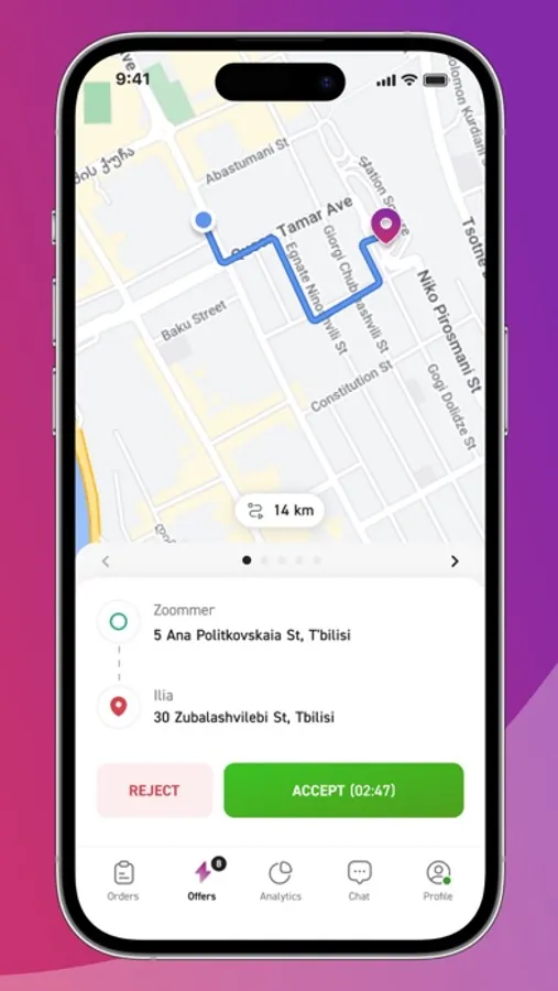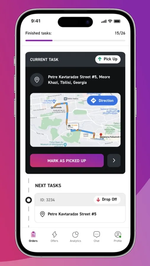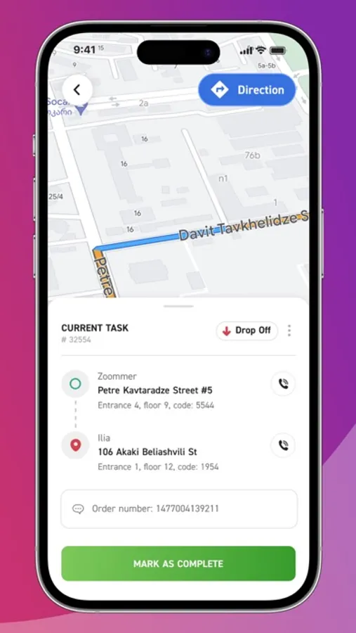 - Receive orders with optimal routers and detailed information about pick up & drop off locations