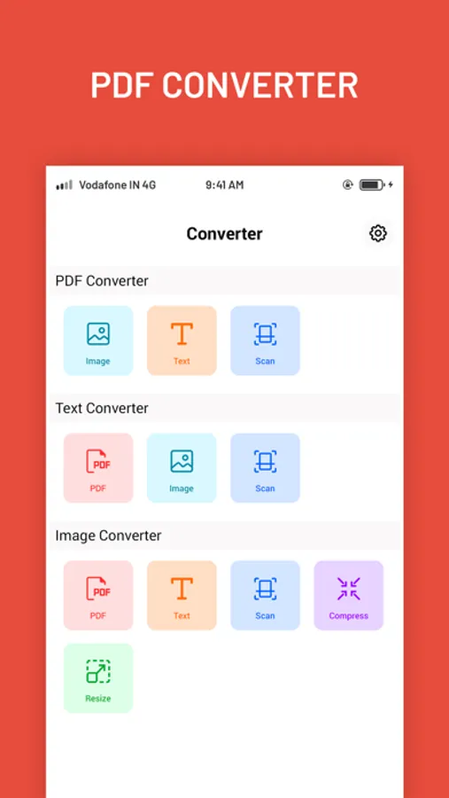 Main features of apps are Images To PDF , Text To PDF , Scan To PDF , Compress Image , Resize Image , Scan To Image , Text To Image , PDF To Image , Image To Text , PDF To Text , Scan To Text.