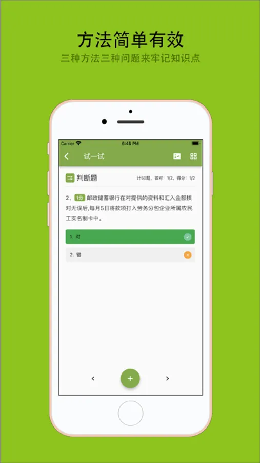APP分三个栏目,分别是:练一练,可以将题库里所有的题都做一遍;试一试,模仿考试的形式随机出题来做;拼一拼,可按设置的出错概率来攻克难点。