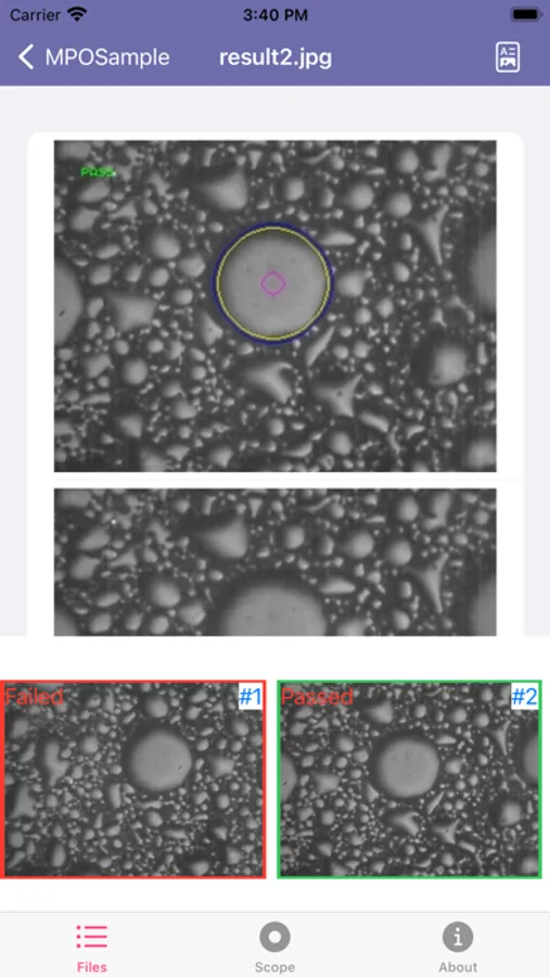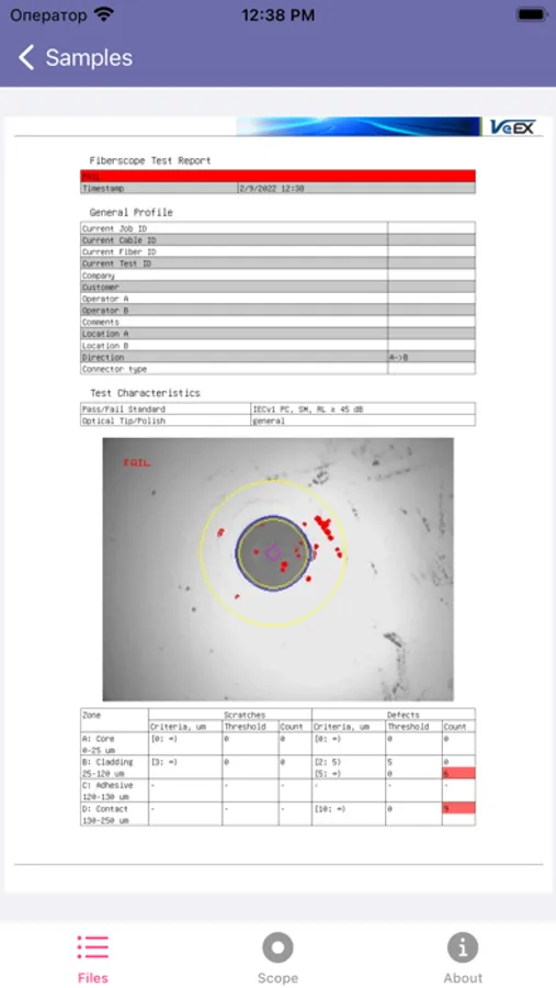 App designed to work with a variety of VeEX Fiberscopes (DI-3000, DI-1000, DI-1000MPO). View connector end faces for contamination, dents and/or scratches. Pass/Fail Analysis in accordance with IEC-61300-3-35 standards. Save images in .jpg files format.