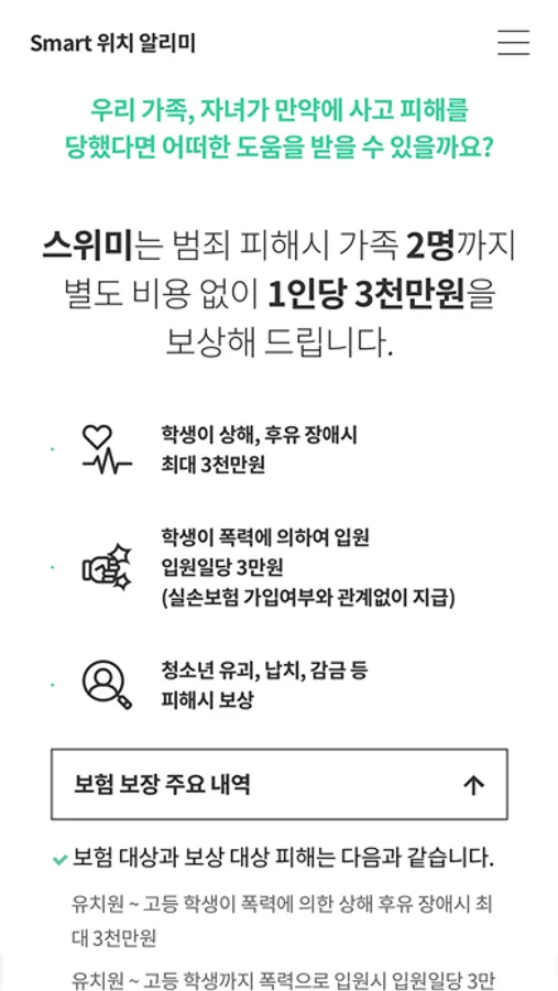 또한 폭력, 상해, 납치, 실종 등의 범죄 피해시에 최대 3천만원까지 별도 추가 비용 없이 보험 약관과 절차에 따라 보상을 해드립니다.
