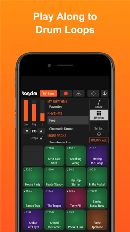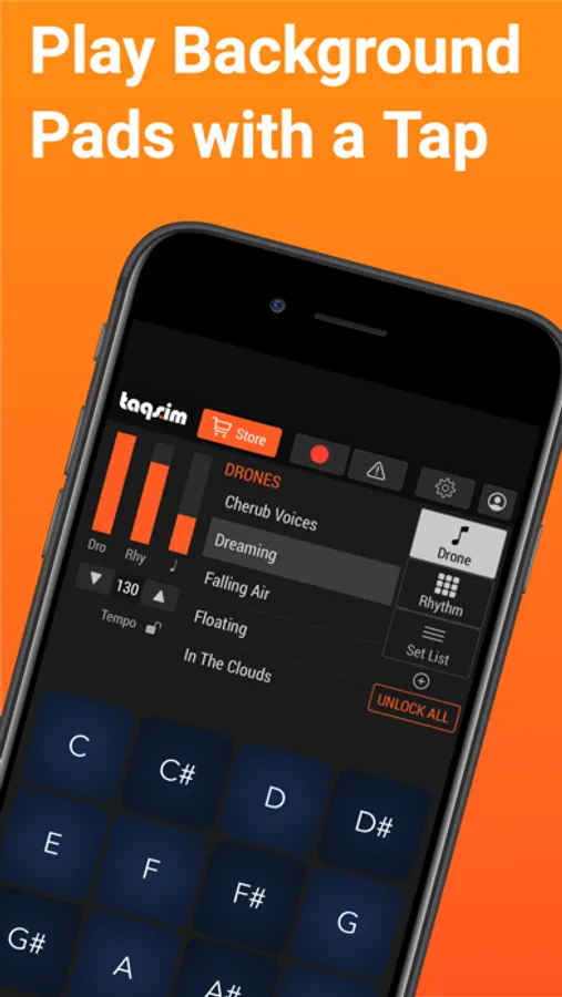 Enjoy playing professional background pads and drum loops with Drone Pad. From Analog Pads to Global Drones and Beats everything in between, Drone Pad has exclusive sounds right at your fingertips.