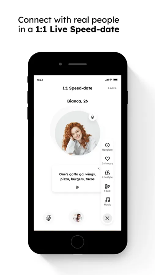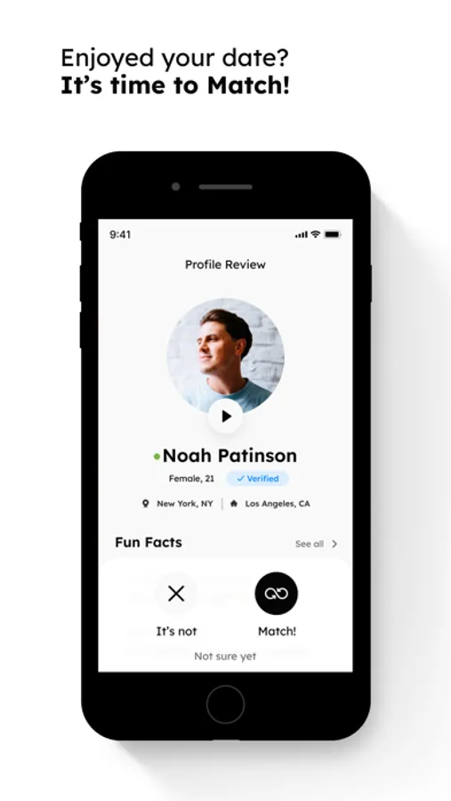 Feeling a little more daring? Try jumping straight into a live-roulette speed-dating experience. We’ll match you with other people who meet your preferences that are online and ready to connect for a gamified 3-minute speed date, complete with ice-breaker questions and conversation drivers. No spoilers: the picture will be blurred at the beginning, revealing your date’s face as the date goes on - so you can focus on connecting, first. And if you both feel like 3 minutes isn’t enough, you’ll have the opportunity to extend the call for an additional 3 minutes (if you both agree, of course) and let that connection keep growing. Same rules apply- you’ll have the opportunity to see the person’s full profile with fun facts, intentions, and more photos giving you the chance to decide if it’s a match or not as the date goes on.