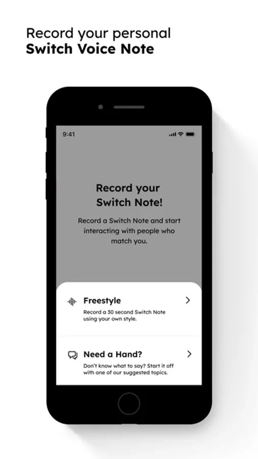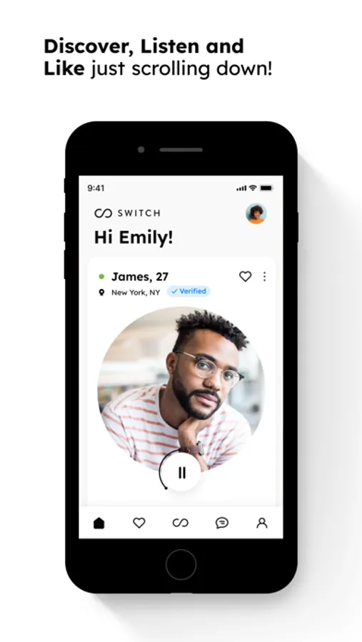 With SWITCH, you can experience real-time conversation - and real-time connection - right from your phone. To start, you’ll create your SWITCH Note: an audio message that gives a little glimpse of who you are. Choose from prompt options for inspiration - or freestyle and say whatever you feel shows off your true personality. Once you’re ready, it’s time to explore a timeline of profiles to choose your next 1:1 speed date from.