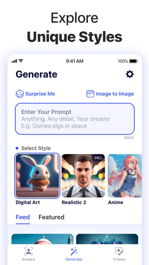 AI Arta has mastered a variety of art styles and techniques: from cartoonish pencil sketches to mind-blowing photorealism. Experiment with styles and see which one captures your idea best.
