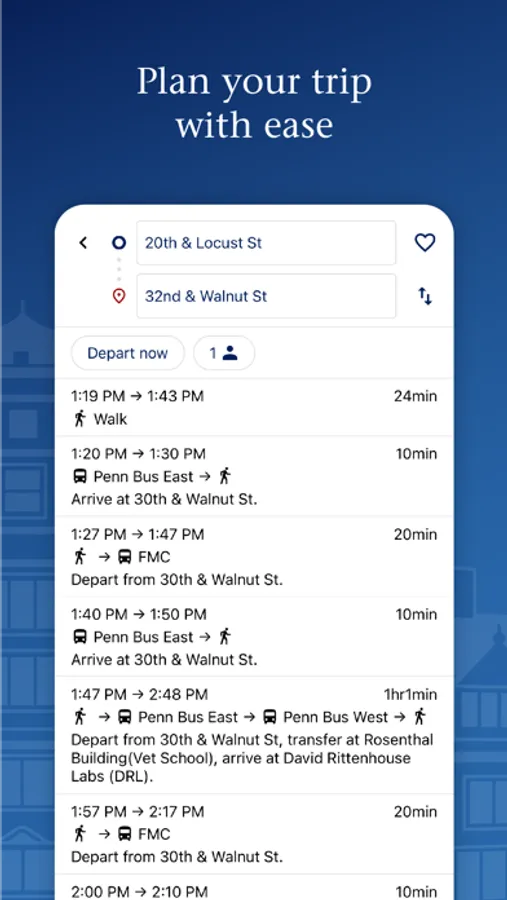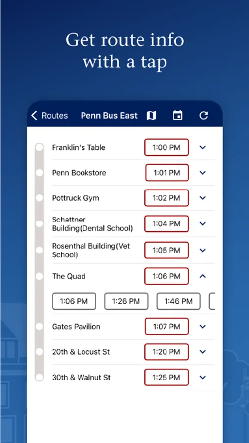 PennTransit Mobile helps you travel to, from, and around campus and the surrounding neighborhoods easily. See all of your options in one place: Penn Bus East and West, On-Demand Shuttles, and specialty services like the Pennovation Works Shuttle and Penn Accessible Transit. This app provides you accurate vehicle locations and arrival times, ensuring you have the information you need when you need it so you can arrive safely and on time. Simply download the app, login securely with your PennKey, and you're ready to go!