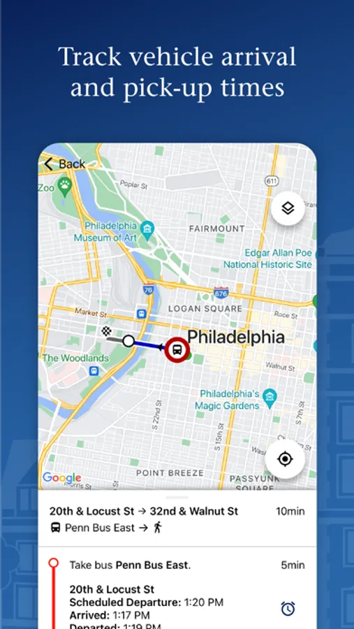 Schedule & Route Review—view route schedules on a stop-by-stop basis on all available routes so you can plan every trip ahead of time. The app also lets you know our service area boundaries so you can see if you need to use complimentary transportation such as SEPTA, LUCY, or Drexel Bus to get you to your final destination.
