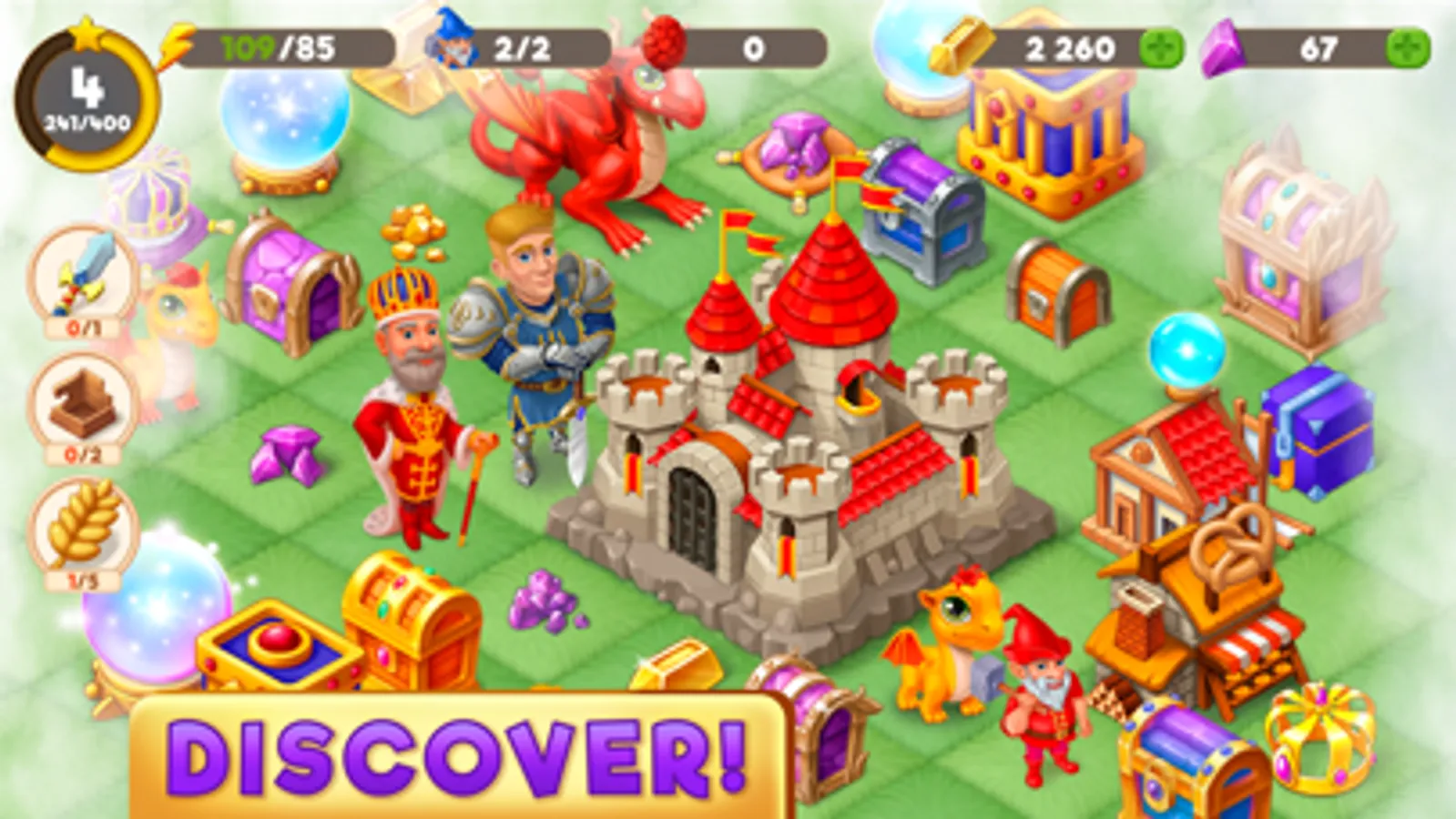 Get ready to be part of a magical story with castles, kingdoms and dragons. This is an exciting quest with brave characters, entertaining stories and magic. Now, it has become even easier to build your kingdom. Just merge the identical objects and see how fast your kingdom is growing. It is not so difficult to build a gigantic castle anymore.