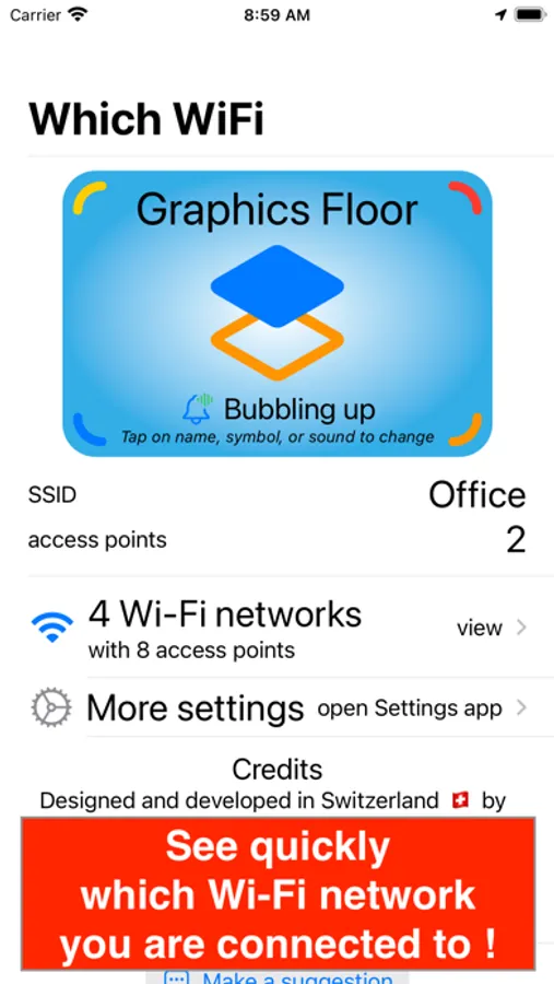 A small symbol in the top-right corner of your device shows that you are connected to Wi-Fi. But which Wi-Fi? You may slide down the top right corner of you screen and then long-press the Wi-Fi symbol to finally see the SSID of your Wi-Fi. Or you may look for the Settings app and open it. But you still don't know which access point. And your device does not tell you when you switch, connect, or disconnect. The Which WiFi app tells you, instantly.