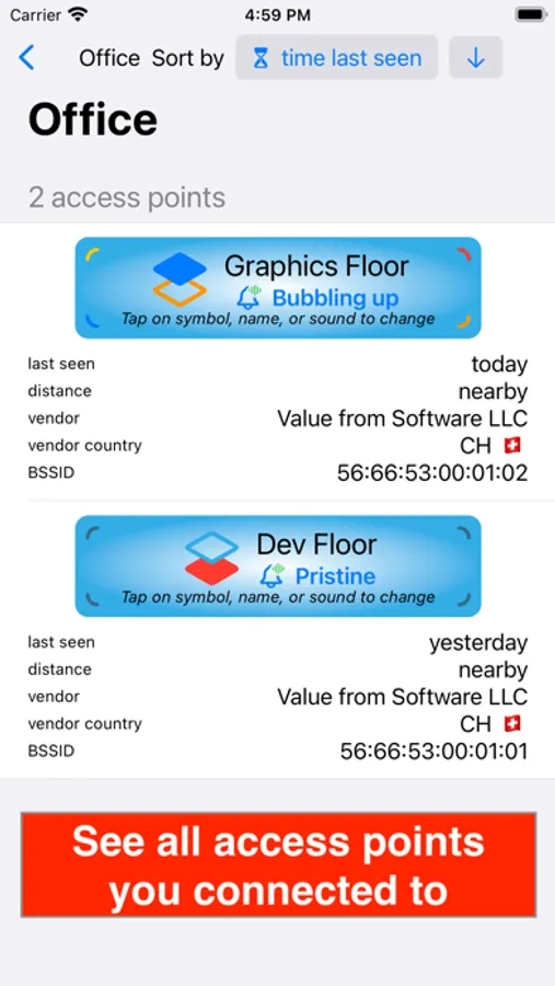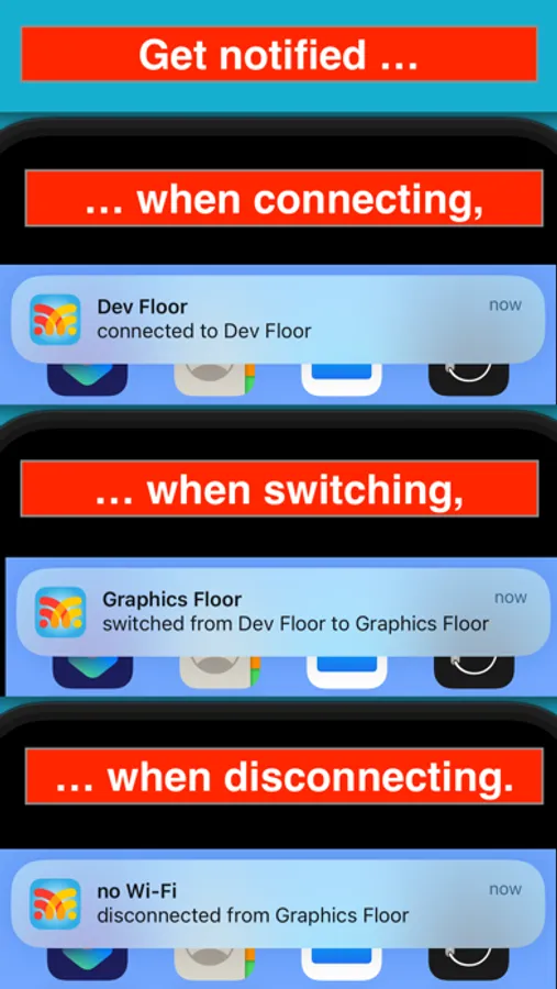 See instantly which Wi-Fi you are connected to! Get notified when you connect, switch network or access point, or disconnect. See your Wi-Fi connection on your Lock Screen, your Home Screen, your Today View. or in StandBy. Distinguish between different access points serving the same Wi-Fi network. Assign individual names, colored icons, and sounds to your access points. See which Wi-Fi networks and which access points you were connected to.