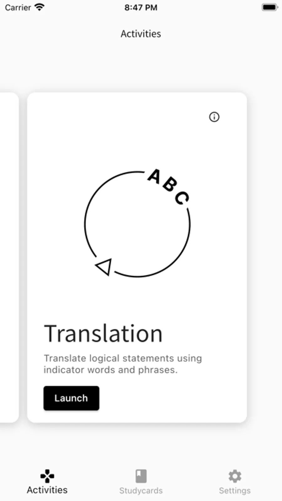 4. Translation: Translation aids the student in translating statements with indicator words and phrases into logical statements. Indicator words and phrases are commonly used in logic books and courses to help the student get a "sense" for how to translate a statement in a human language into a statement in logic. Translation breaks them down into a set of levels and allows the user to set new scores as they reach new levels of proficiency.