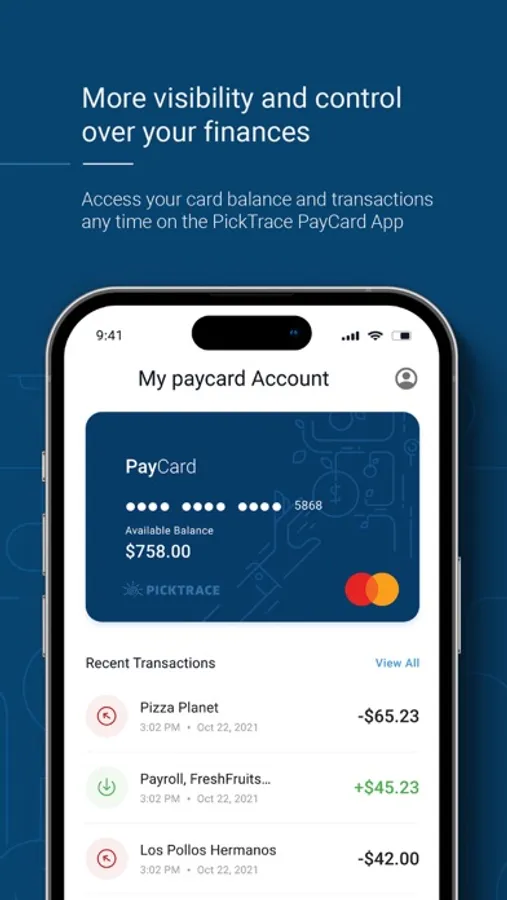 Easily and securely access your finances with the PickTrace PayCard App. You can view your card balance and transaction history.