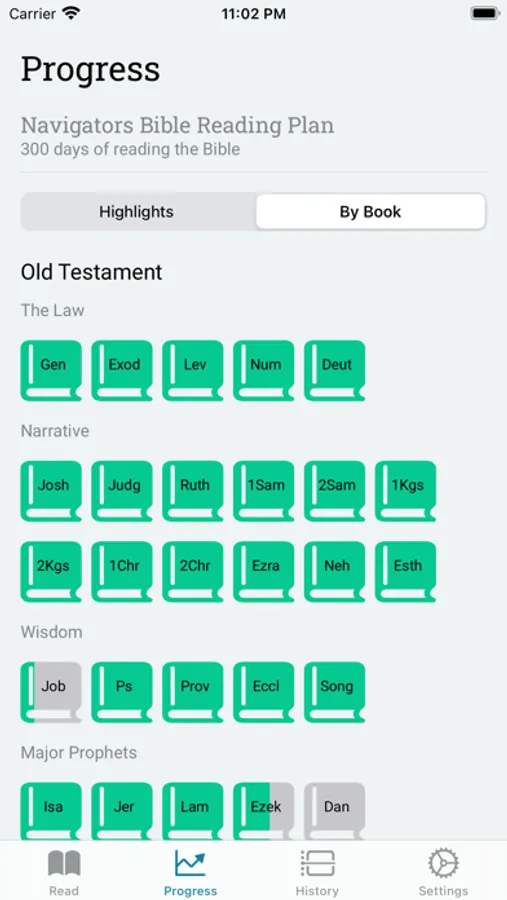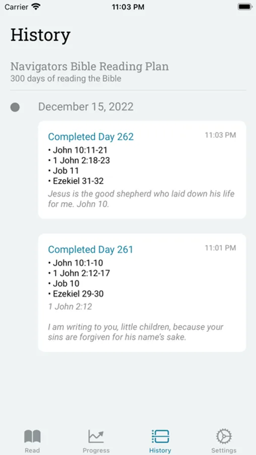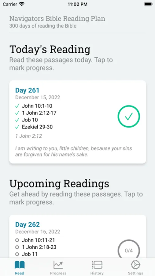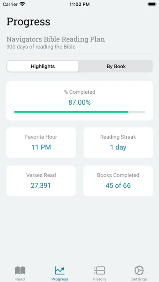 - Progress highlights. View your daily reading streak, favorite hour to read, how many verses you've read in total, and more.