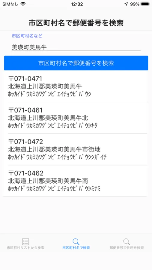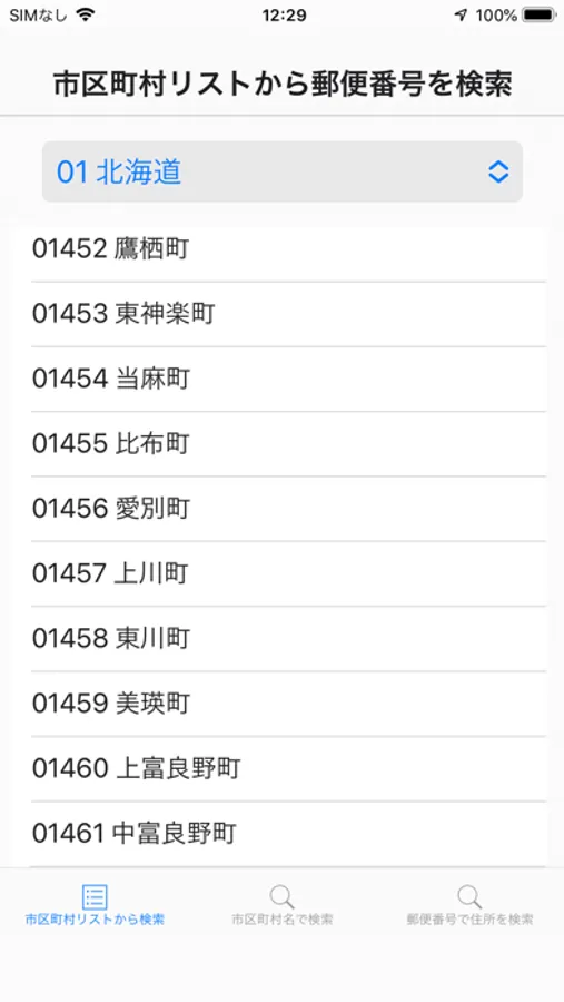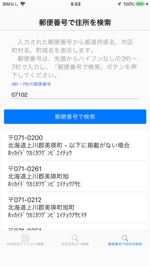 当アプリは、日本郵便が公開している郵便番号データを用いて郵便番号を検索したり、郵便番号から都道府県名、市区町村名、町域名を表示します。